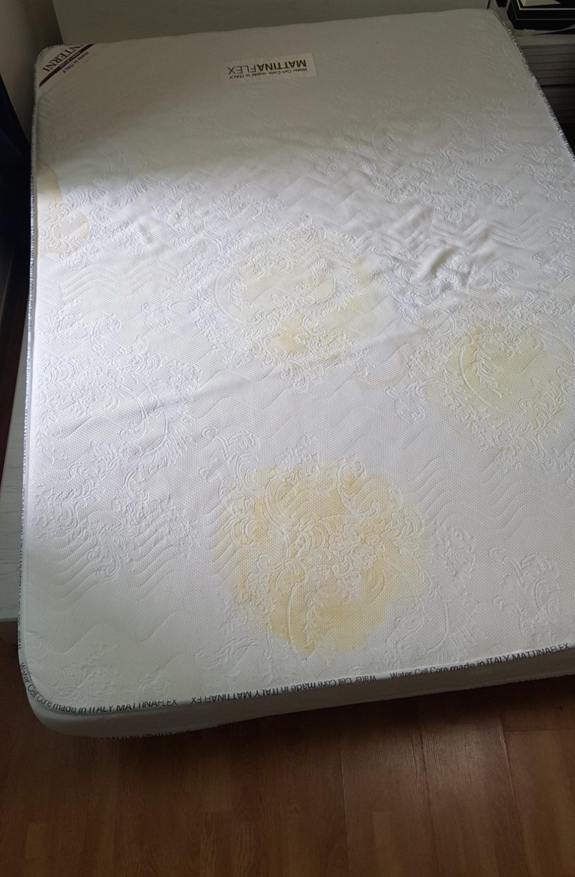 이제 매트리스를 뒤집고 뒷면을 보시면? 더 심각한 얼룩을 확인하실 수 있습니다.