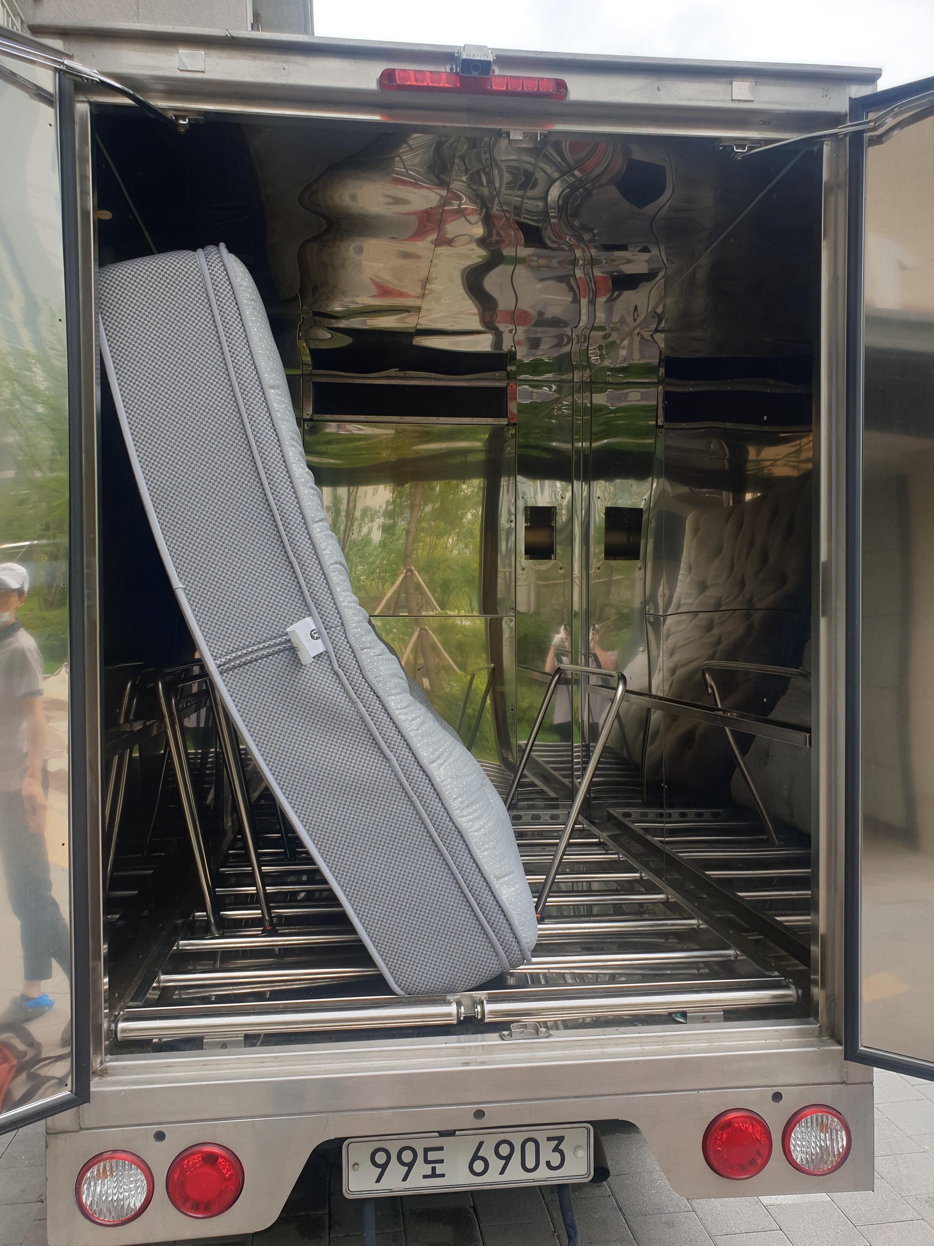 지움에서 직접 제작 개발한 건조 차량은 매트리스를 차량 내부에 통째로 집어넣습니다.