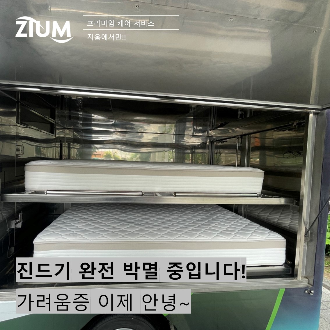 지움(ZIUM)의 ‘고온건조 차량 시스템’은 90~110도 고온의 열풍으로 매트리스 속 진드기와 세균을 완전히 삶아내듯 제거합니다.