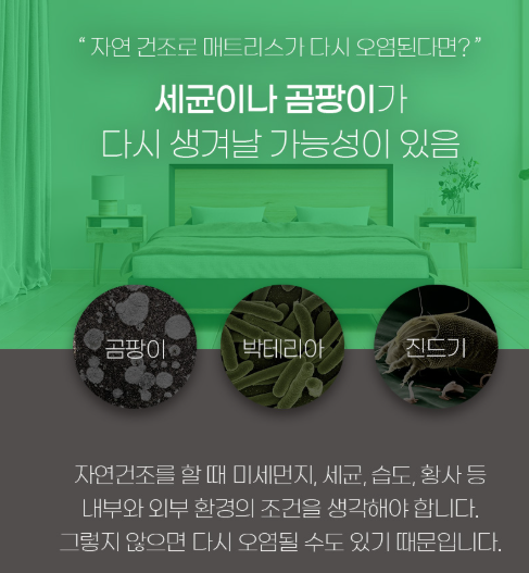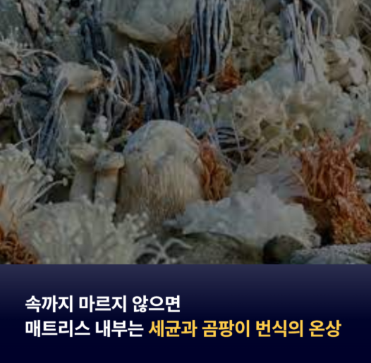 - 세균 및 곰팡이 번식: 제대로 건조되지 않은 매트리스 내부는 습한 환경이 조성되어 세균과 곰팡이가 번식하기 최적의 장소가 됩니다. 이는 호흡기 질환이나 피부 알레르기의 원인이 될 수 있습니다.