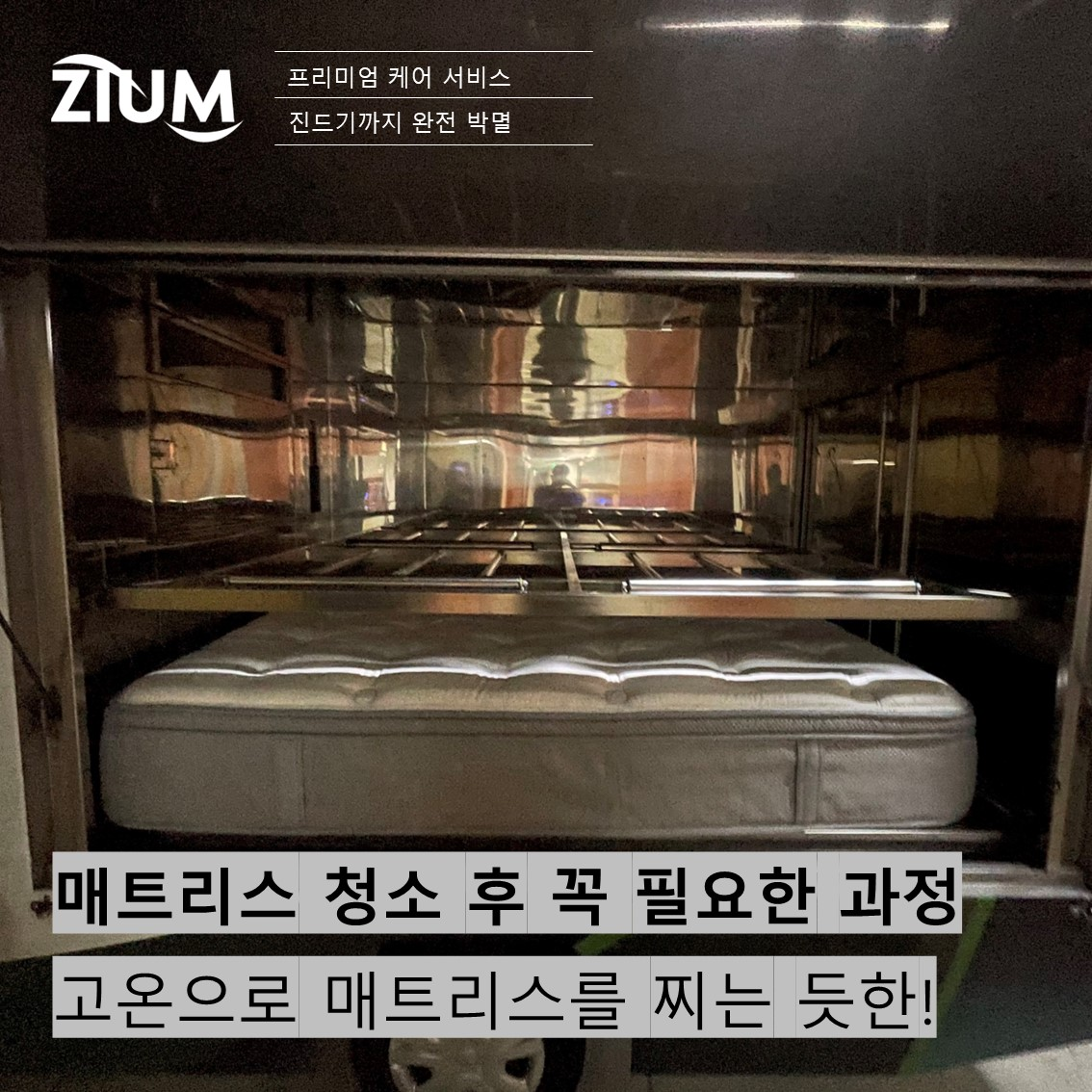 위 사진은 지움(ZIUM)의 고온건조열풍 차량 안에서 매트리스가 완벽하게 건조되고 있는 모습입니다. 마치 '고온으로 매트리스를 찌는 듯한!' 효과로, 매트리스 속 유해균까지 박멸하며 뽀송함을 넘어선 살균 케어를 완성합니다. 오늘은 지움이 왜 매트리스 청소 후 고온 건조를 필수 과정으로 여기는지, 그리고 지움만의 특별한 고온 건조 시스템이 무엇인지 자세히 설명해 드리겠습니다.